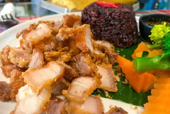 Ovenbaked Pork Belly Slab marinated with Rock Salt, Cracked Black Pepper, Star Anise, Garlic & Lemongrass ⏱️ 30–45 minutes cooking time Served with: Rice, Papaya Atsara, Chicken Liver Sauce Chili optional